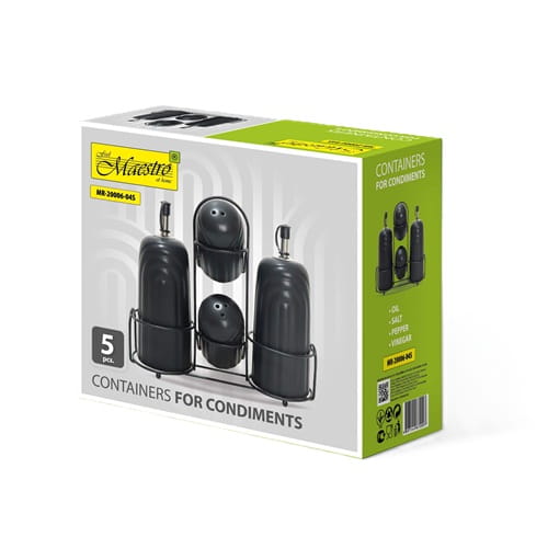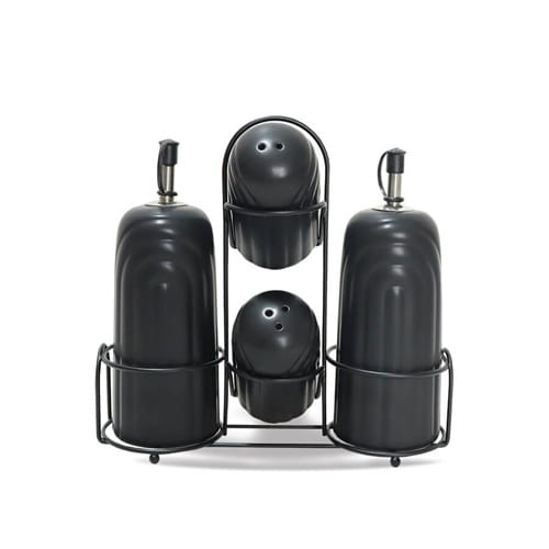 W skład zestawu wchodzą solniczka oraz pieprzniczka o pojemności 100 ml, które zostały zaprojektowane z myślą o wygodzie użytkowania. Można je łatwo uzupełniać, a ich średnica wynosząca 9 x 5,5 cm sprawia, że są kompaktowe i łatwe do przechowywania. Nieodłącznym elementem zestawu są również eleganckie butelki do octu i oleju, każda o pojemności 300 ml i wymiarach 17,5 x 6 cm, które umożliwiają łatwy dostęp do ulubionych składników podczas gotowania.