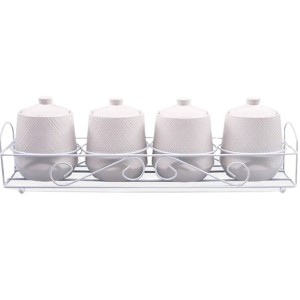 Stojak stalowy, malowany proszkowo, jest nie tylko praktycznym ustawieniem dla tych pięknych pojemników, ale także stanowi estetyczny akcent, który będzie przyciągać uwagę w Twojej kuchni. Dzięki temu zestawowi ceramicznych pojemników będziesz mógł przechowywać i organizować swoje przyprawy w sposób funkcjonalny i stylowy.